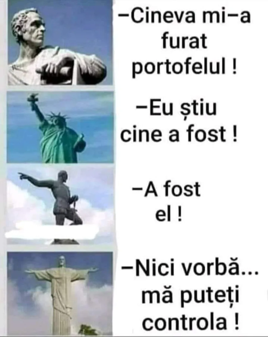 Bancul de astăzi este o reprezentare a celor mai importante și cunoscute statui din lume. Coincidență sau nu, acestea au devenit ținta internauților, iar de aici a mai fost doar un pas până la nașterea unei glume tare haioase. Spor la râs!