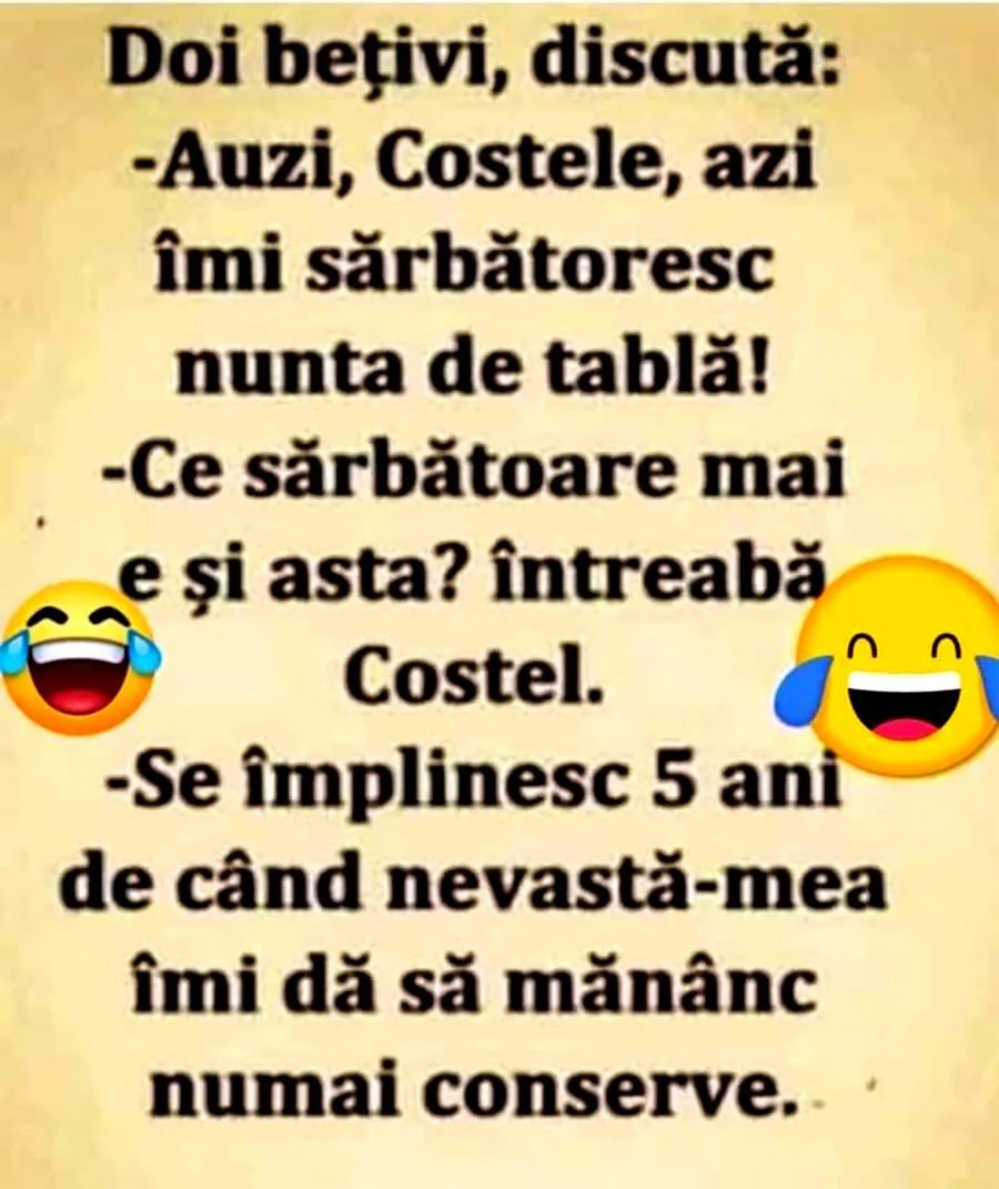 – Se împlinesc 5 ani de când nevastă-mea îmi dă să mănânc numai conserve.