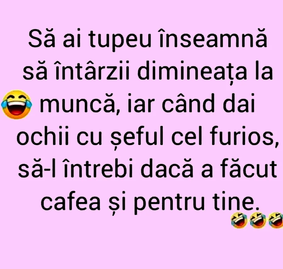 Nu trebuie să treacă nicio zi fără o porție copioasă de râs, iar pentru asta am pregătit un banc care cu siguranță o să îți aducă zâmbetul pe buze. Astăzi avem în discuție culmea tupeului la serviciu. Angajații întârziați sunt în vizor.