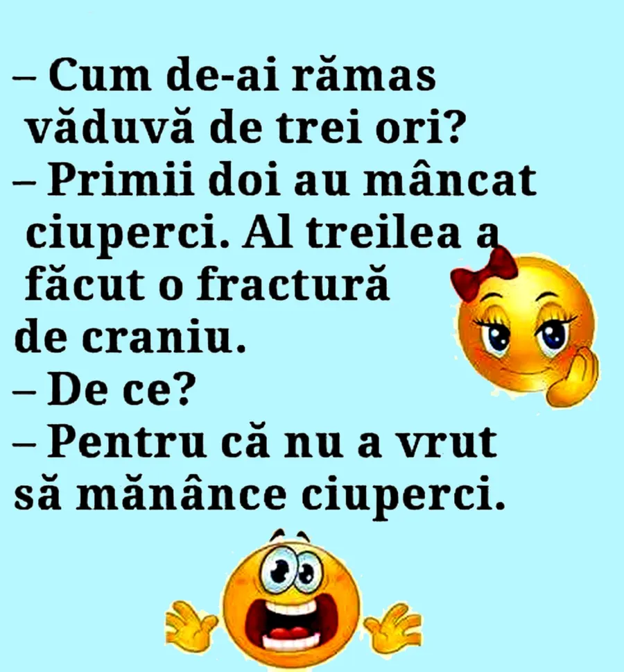 – Primii doi au mâncat ciuperci. Al treilea a făcut o fractură de craniu.