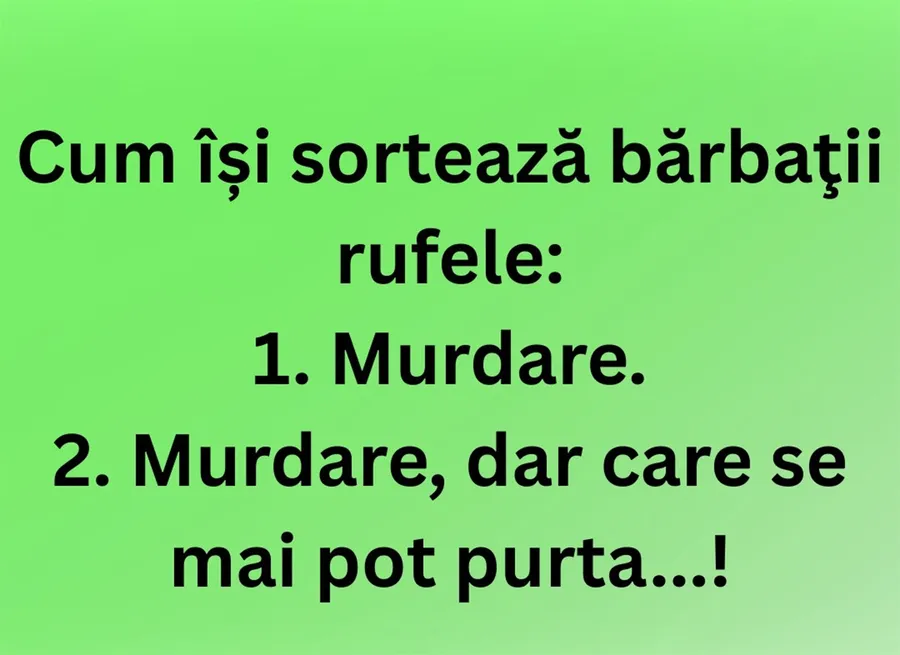 CANCAN.RO ți-a pregătit bancul zilei. De-a lungul generațiilor, despre bărbați s-au făcut tot felul de glume, unele dintre ele fiind parcă inspirate din viața de zi cu zi a protagoniștilor. Îți prezentăm o situație care te va amuza copios. Tu știai cum își sortează bărbații rufele?