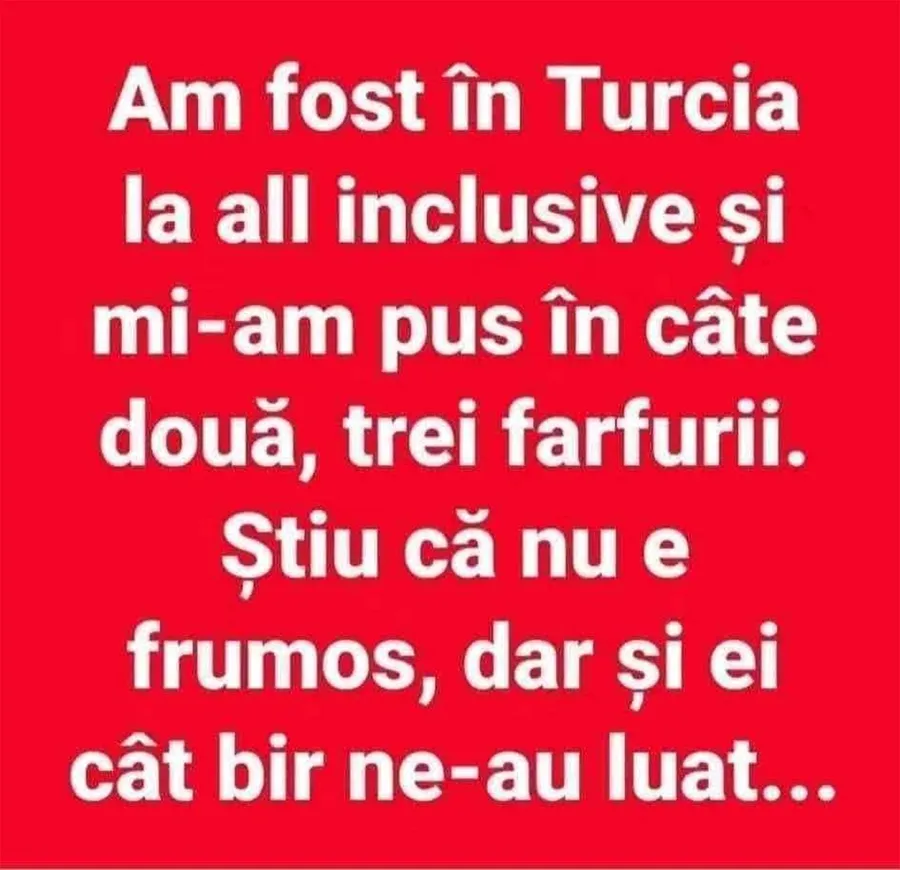 Ajunşi la scurtă distanţă de incipitul weekendului, CANCAN.RO ţi-a pregătit un banc perfect pentru a dobândi o bună stare de spirit şi a încheia ziua cu un zâmbet. Află de ce își umple cu adevărat românii farfuriile la all-inclusive în Turcia.