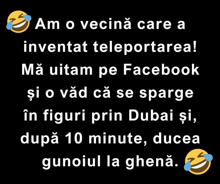 Am o vecină care a inventat teleportarea! Mă uitam pe Facebook și o vad că se sparge în figuri prin Dubai și, după 10 minute, ducea gunoiul la ghenă.