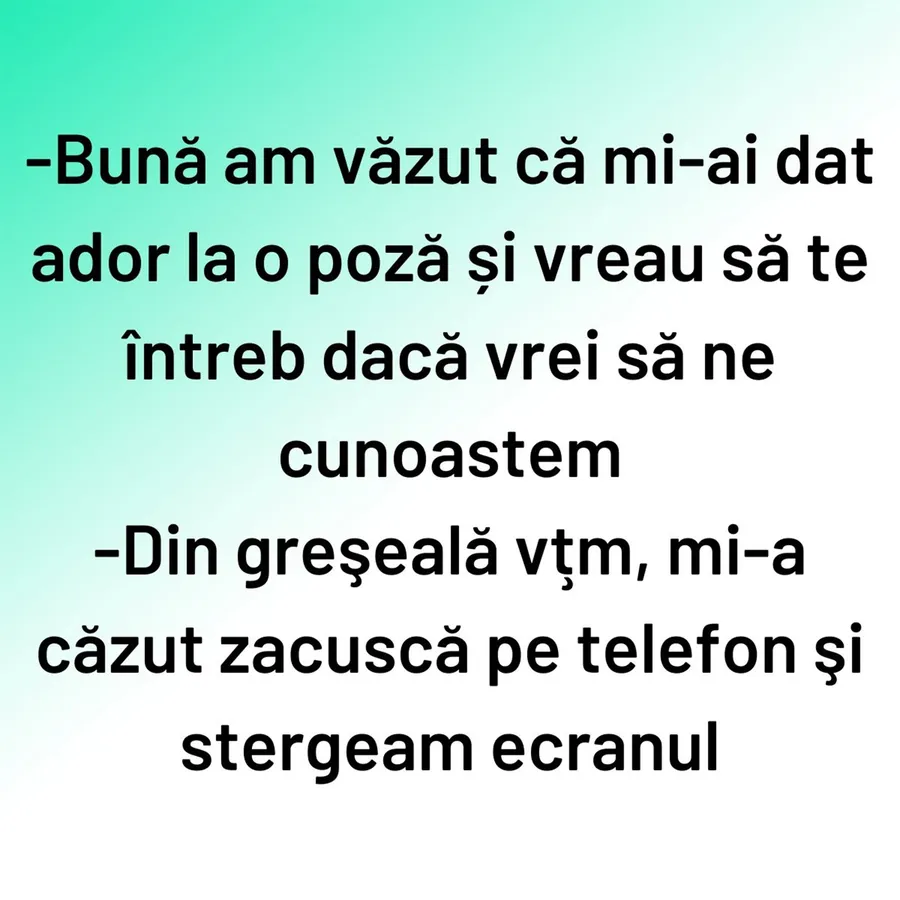 – Din greșeală vțm, mi-a căzut zacuscă pe telefon și ștergeam ecranul.