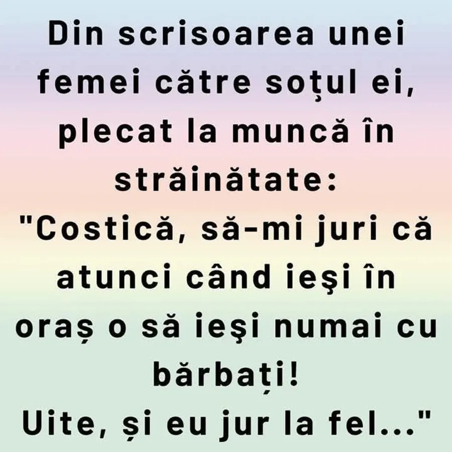 Din scisoarea unei femei către soțul ei, plecat la muncă în străinătate: „Costică, să-mi juri că atunci când ieși în oraș o să ieși numai cu bărbați! Uite, și eu jur la fel…”