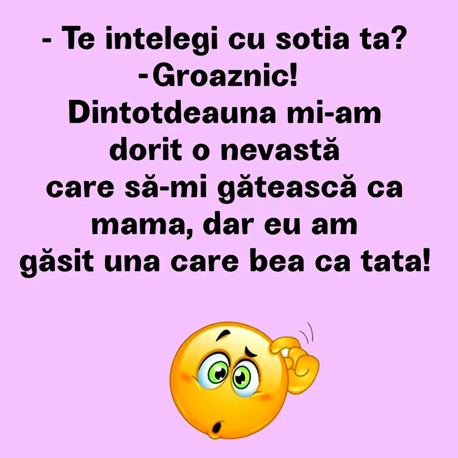 -Groaznic! Dintotdeauna mi-am dorit o nevastă care să-mi gătească așa cum făcea mama, dar eu am găsit una care bea ca tata!”