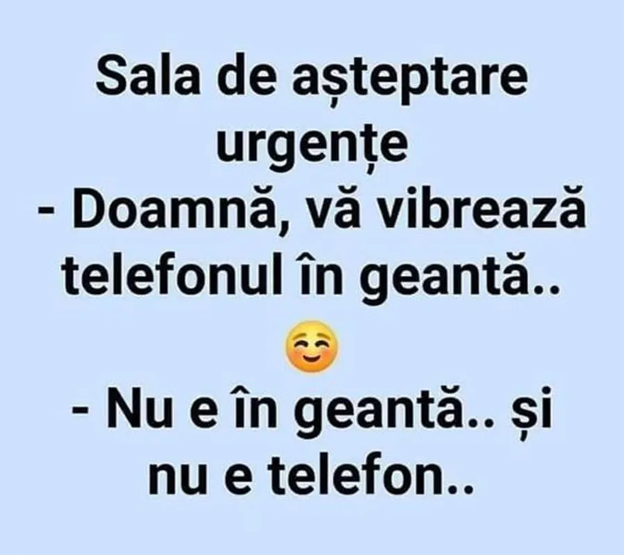 Nu trebuie să treacă nicio zi fără o porție copioasă de râs, iar pentru asta am pregătit un banc care cu siguranță o să vă aducă zâmbetul pe buze. Protagonista de astăzi este o doamnă ce ajunge la spital, la urgențe. Aceasta provoacă puțină confuzie în sala de așteptare, iar deznodământul este hilar.