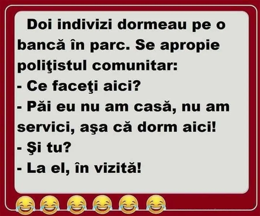 Bancul zilei. Doi indivizi dormeau pe o bancă, în parc. Moment în care se apropie de ei un polițist comunitar și îi ia la întrebări. Dialogul stârnește amuzament! Spor la râs!