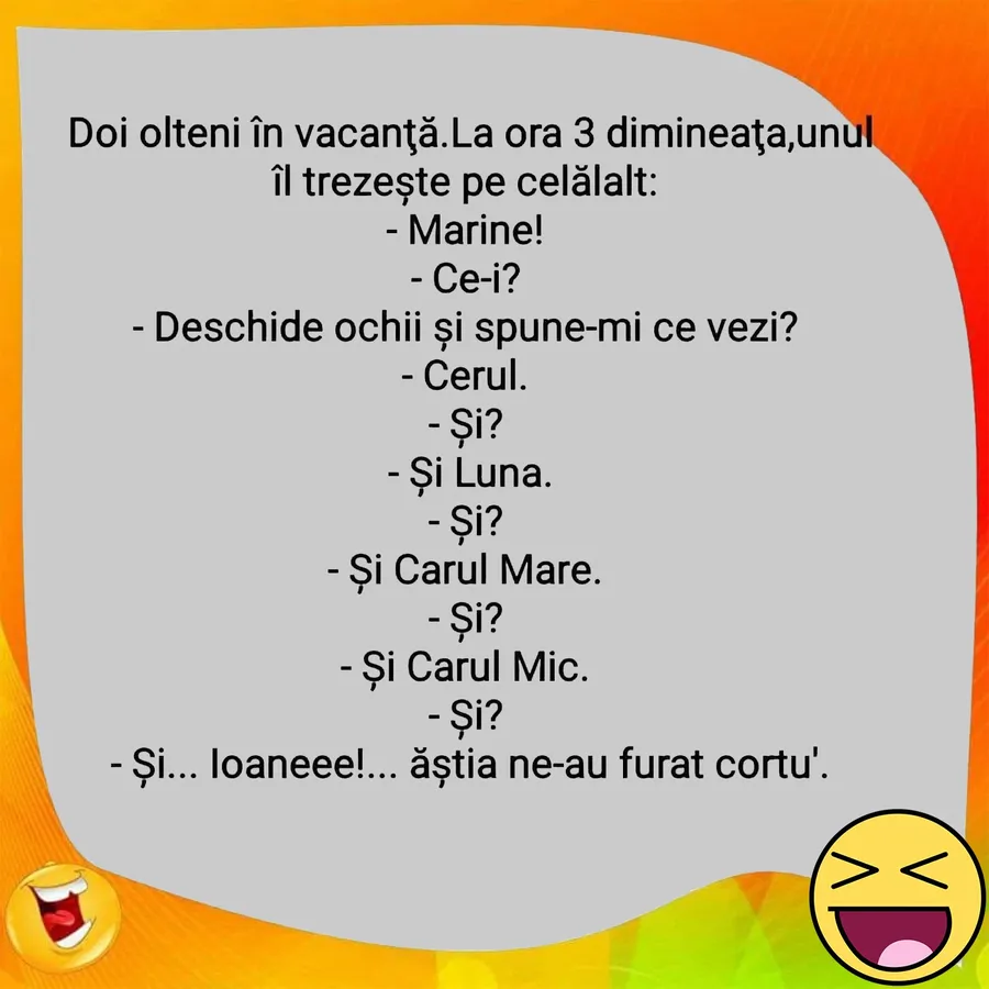 Dragi cititori, CANCAN.RO vă prezintă un banc savuros cu olteni. Fie că sunteți din acea zonă a României, fie că nu, această glumă o să vă aducă zâmbetul pe buze. Spor la citit și voie bună!
