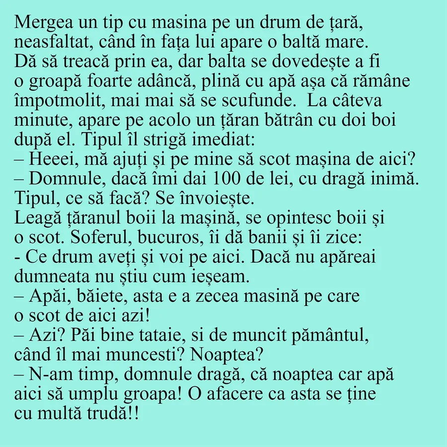 Mergea un tip cu mașina pe un drum de țară, neasfaltat, când în fața lui apare o baltă mare. Dă să treacă prin ea, dar balta se dovedește a fi o groapă foarte adâncă, plină cu apă, așa că rămâne împotmolit, mai să se scufunde. La câteva minute, apare pe acolo un țăran bătrân cu doi boi după el. Tipul îl strigă imediat: