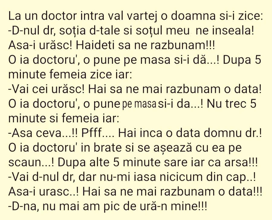 BANCUL ZILEI | „Domnule doctor, soția ta și soțul meu ne înșeală. Hai să ne răzbunăm!”