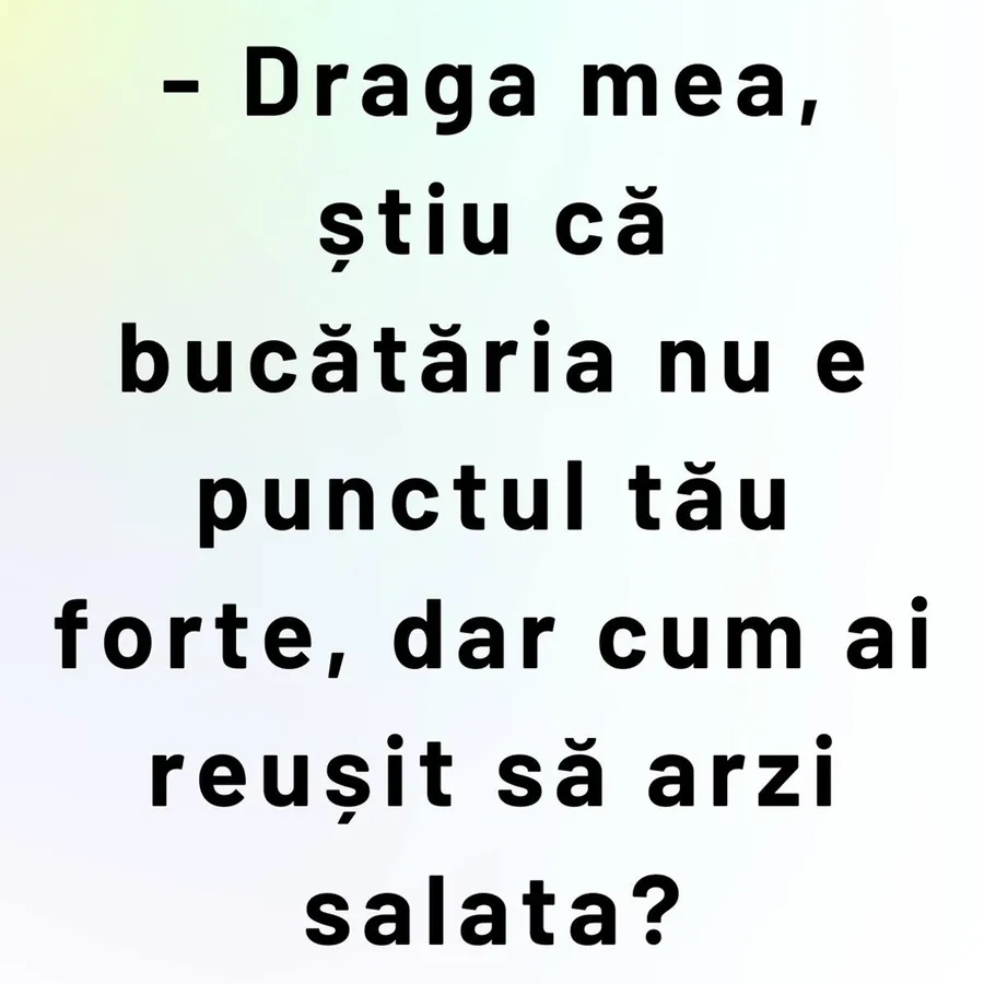 – Draga mea, știu că bucătăria nu e punctul tău forte, dar cum ai reușit să arzi salata?