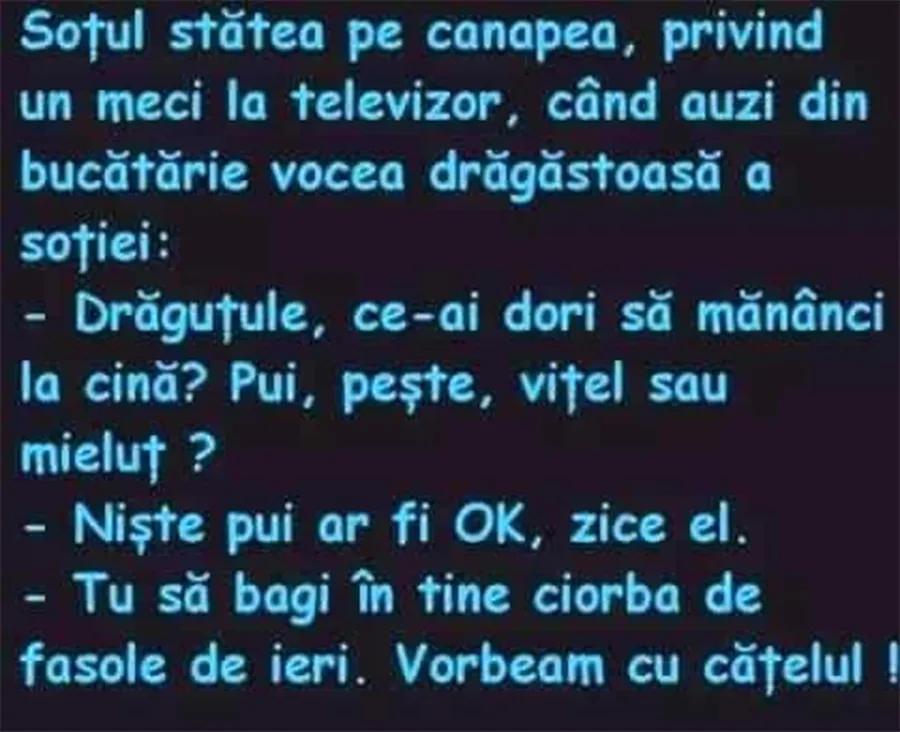 Pentru ca ziua să fie cât mai bună avem nevoie de ceva care să ne aducă zâmbetul pe buze. Așa că am pregătit un banc care cu siguranță te va amuza copios. Protagoniștii de astăzi sunt soț și soție. E vremea cinei, iar bărbatul este surprins de soție. Deznodământul este hilar.