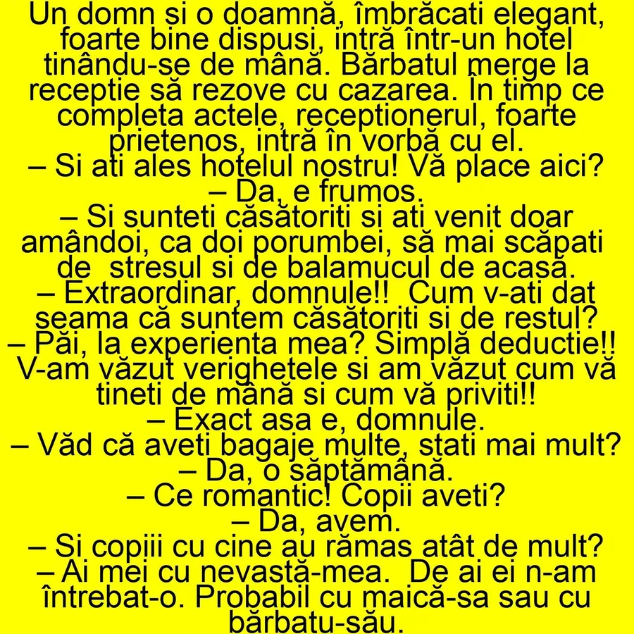 Și de data aceasta CANCAN.RO ți-a pregătit un banc de nota 10. Un domn și o doamnă, îmbrăcați elegant, foarte bine dispuși, intră într-un hotel ținându-se de mână. Bărbatul merge la recepție să rezolve cu cazarea. În timp ce completa actele, recepționerul, foarte prietenos, intră în vorbă cu el.