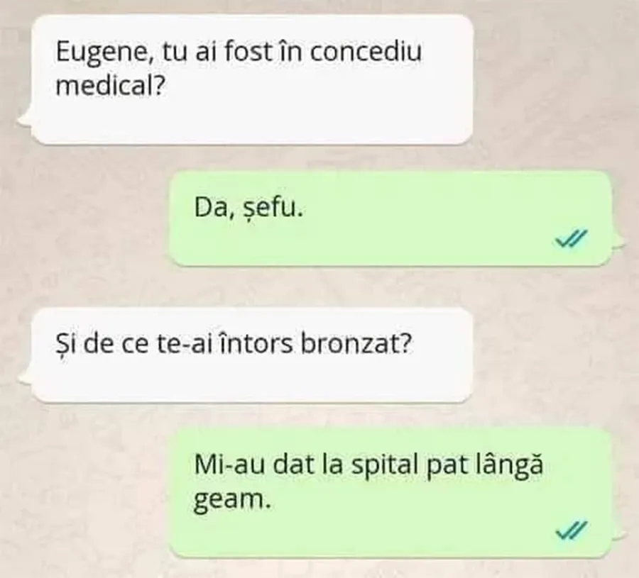 O nouă zi plină de râsete și voie bună! CANCAN.RO îți pune la dispoziție un banc amuzant care să te facă să râzi cu lacrimi. Eugen și-a mințit șefii că stă în concediu medical, însă și-a luat zborul spre o vacanță la mare. Ce explicație hazlie a dat când șeful l-a văzut bronzat?