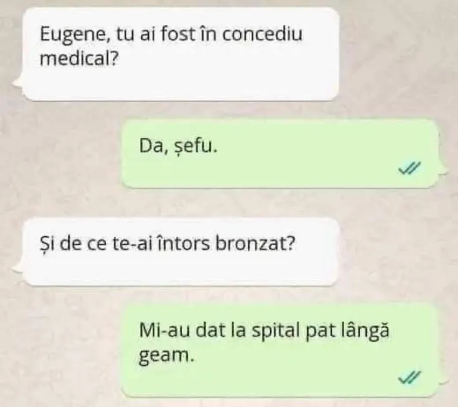 Ziua nu trebuie să treacă fără o porție copioasă de râs, așa că pentru asta am pregătit un banc care o să te amuze copios. Protagonistul de astăzi este un bărbat care și-a luat concediu medical, dar a plecat în vacanță. Șeful a mirosit minciuna, iar deznodământul este hilar.