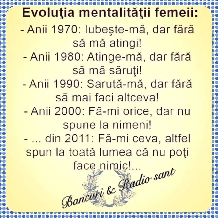 Nu trebuie să treacă nicio zi fără o porție copioasă de răs, iar pentru asta am pregătit un banc care cu siguranță te va amuza copios. Astăzi punem sub lupă evoluția mentalității femeii în ultimii ani. Deznodământul este hilar.