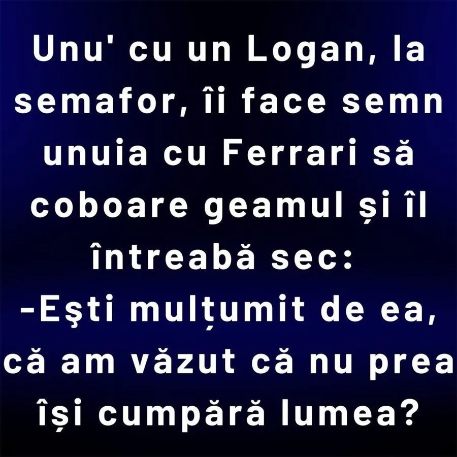 Unul cu un Logan, la semafor, îi face semn unuia cu Ferrari să coboare geamul și îl întreabă sec: