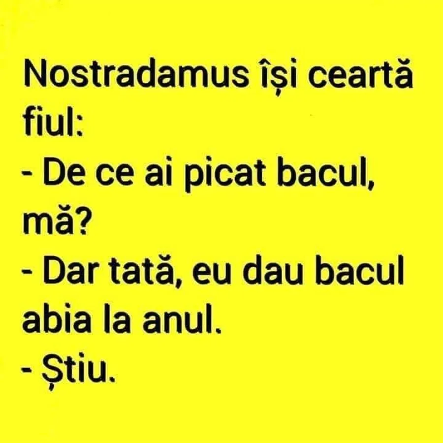 Începutul de weekend nu poate fi marcat decât printr-un banc amuzant. Iată discuția epică dintre Nostradamus și fiul lui.