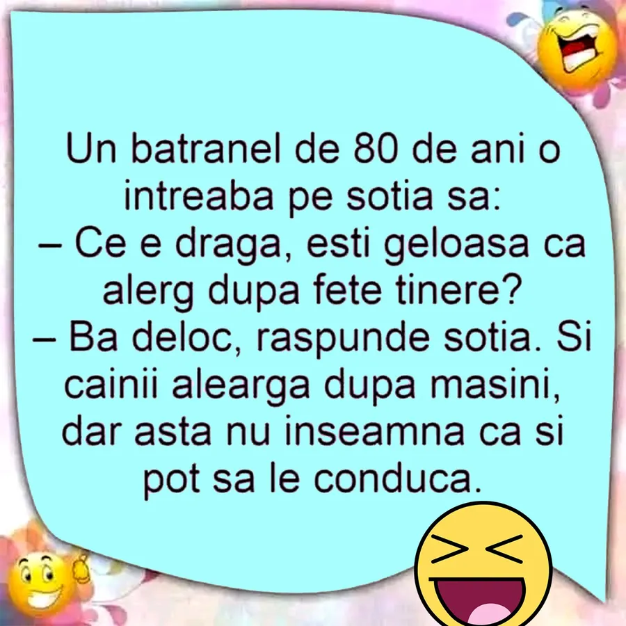 CANCAN.RO ți-a pregătit bancul zilei. Un bătrânel de 80 de ani o întrebă pe soția sa dacă este geloasă pe el. Răspunsul senioarei te va face să râzi cu gura până la urechi.