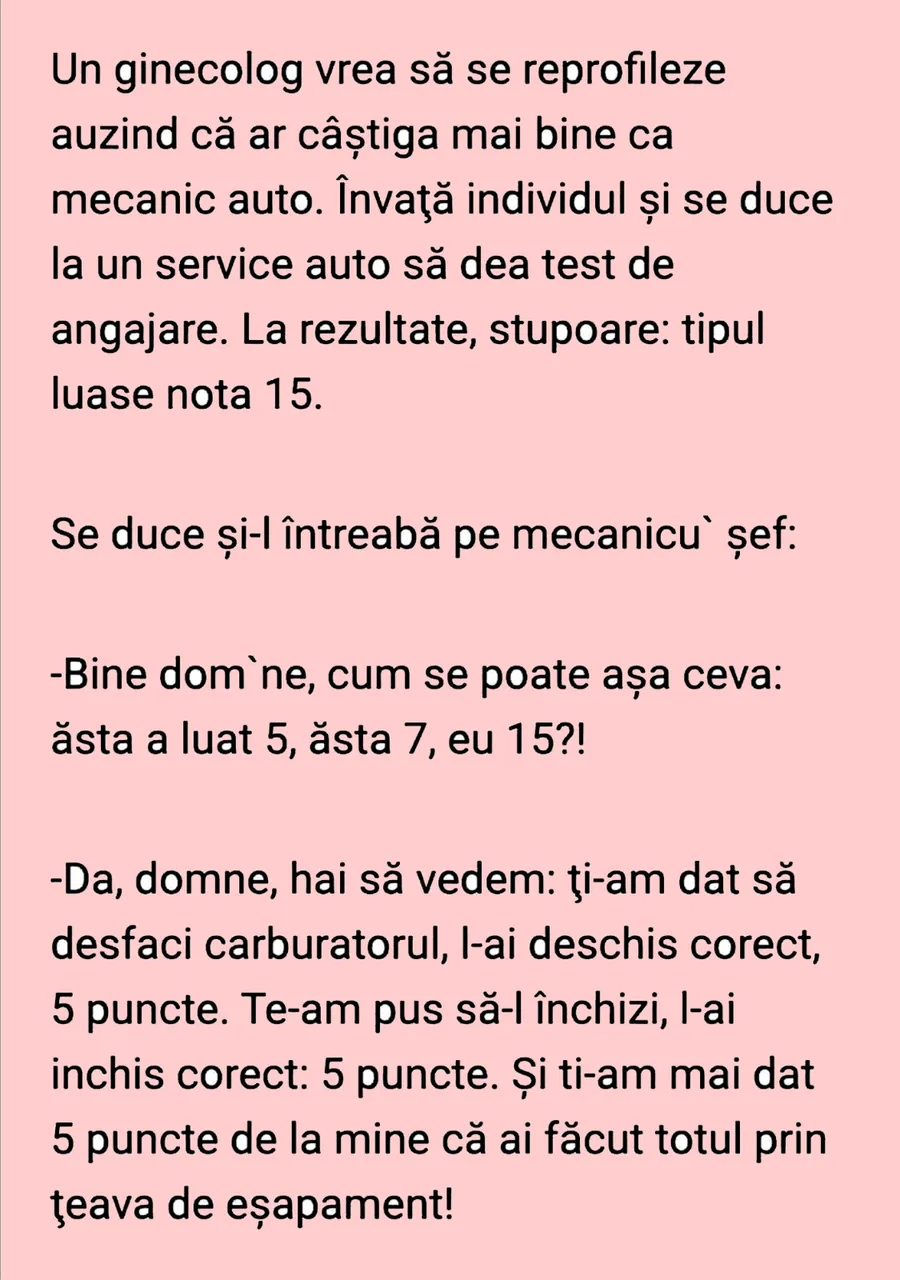 „Un ginecolog vrea să se reprofileze auzind că ar câștiga mai bine ca mecanic auto. Învață individul și se duce la un service auto să dea test de angajare. La rezultate, stupoare: tipul luase nota 15.