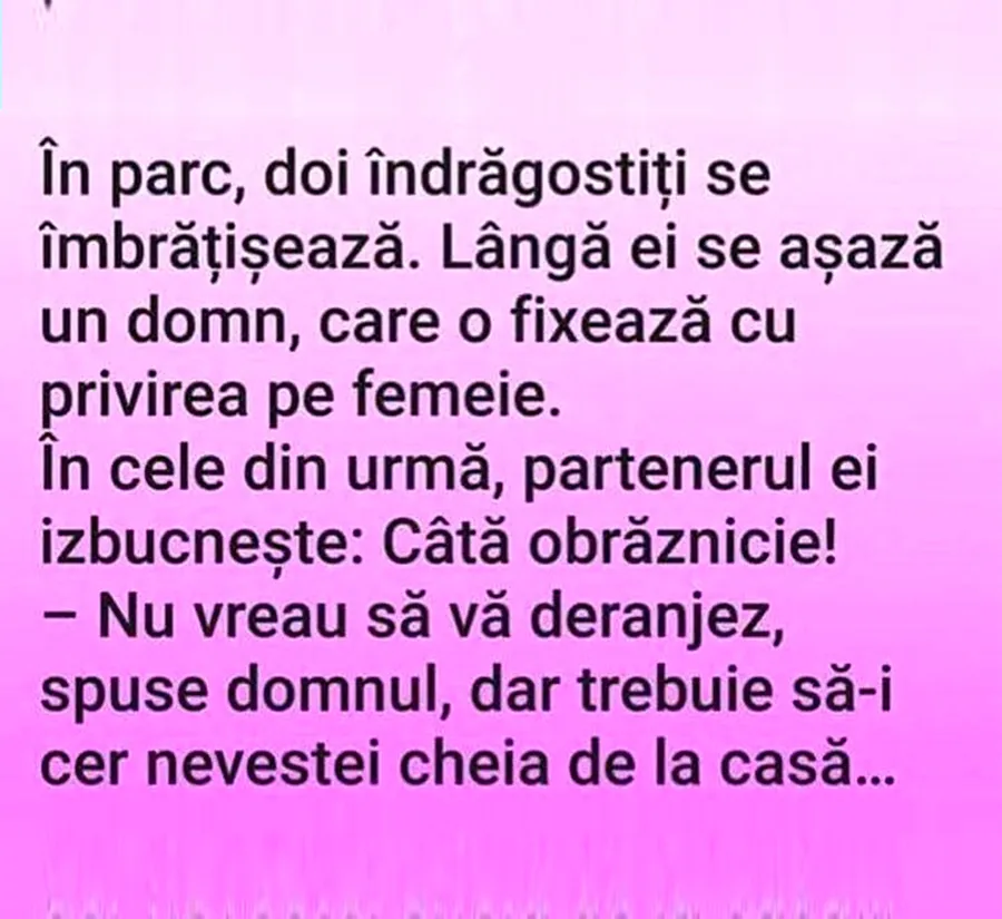 – Nu vreau să vă deranjez, spuse domnul, dar trebuie să-i cer nevestei cheia de la casă…