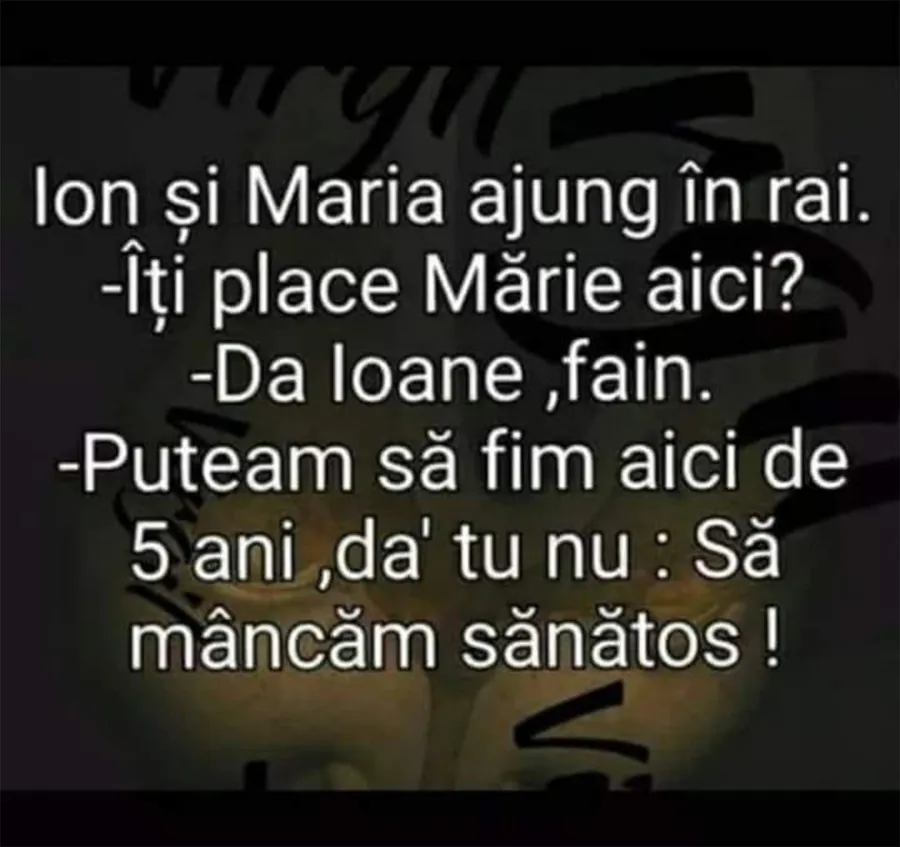 Bancul zilei. Este vineri dimineața și se apropie weekendul, motiv pentru care este momentul să fiți cu zâmbetul pe buze. Ion și Maria ajung în Rai și poartă o discuție care stârnește amuzamentul. Spor la râs!