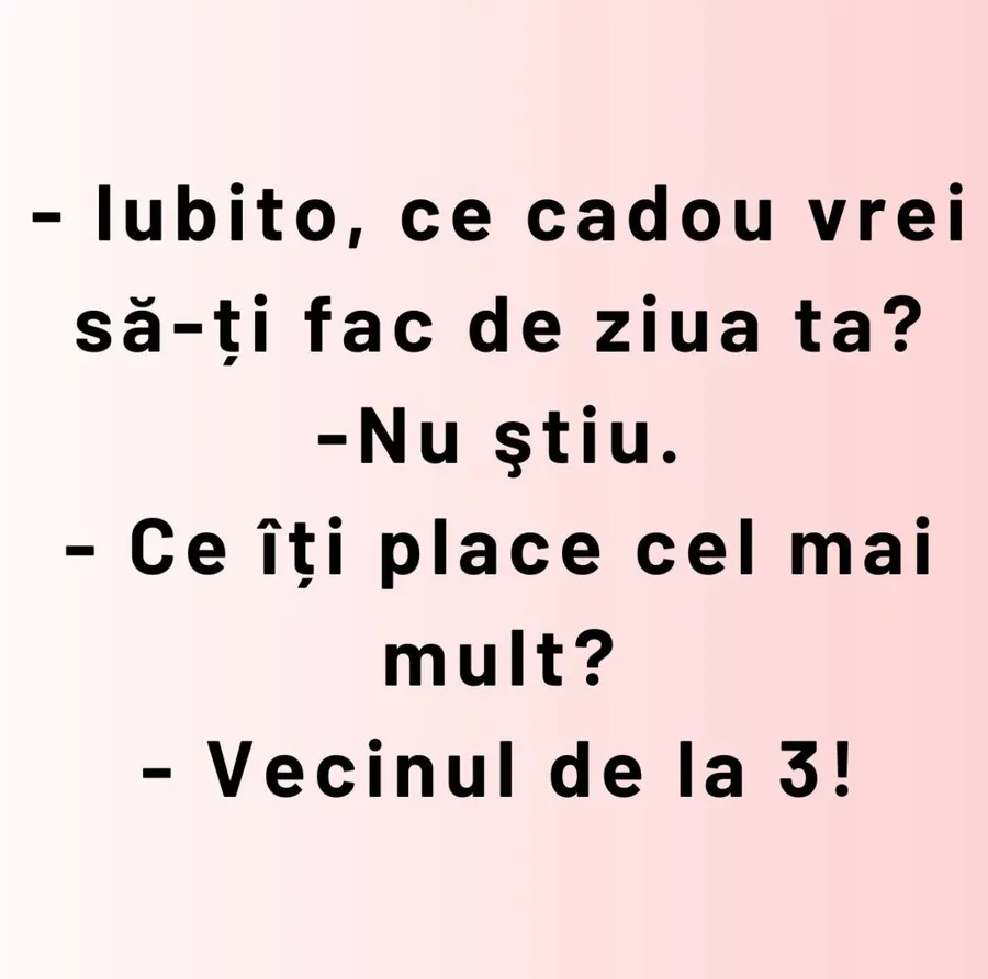 Nu trebuie să treacă nicio zi fără o porție copioasă de râs, iar pentru asta am pregătit un banc care cu siguranță te va amuza copios. Protagonistul de astăzi este un bărbat care încearcă să afle ce cadou și-ar dori iubita lui de ziua ei de naștere. Deznodământul este hilar.