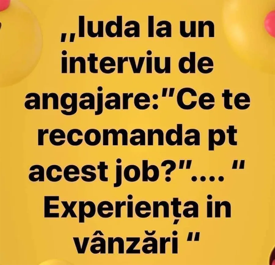 Dragă cititorule, CANCAN.RO ți-a pregătit bancul zilei. Gluma de astăzi îți va aduce zâmbetul pe buze. Iuda merge la un interviu de angajare și este întrebat ce calități îl recomandă pentru job-ul respectiv. Răspunsul te va face să râzi cu gura până la urechi. Spor și voie bună!