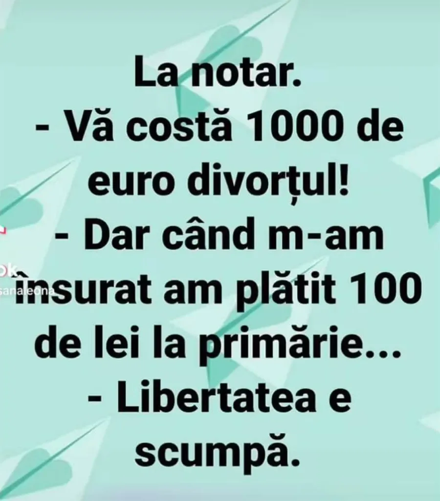 Dragi cititori, nu trebuie să treacă nicio zi fără să râdeți copios. Așadar, CANCAN.RO vă propune un banc de nota 10! O persoană nu înțelege de ce este așa scump să divorțezi, iar notarul îi dă o replică genială. Spor la citit!