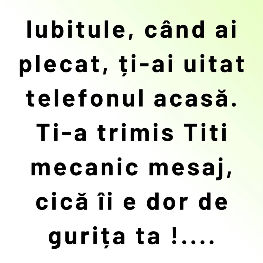 Iubitule, când ai plecat ți-ai uitat telefonul acasă. Ți-a trimis Titi mecanic mesaj, cică îi e dor de gurița ta.