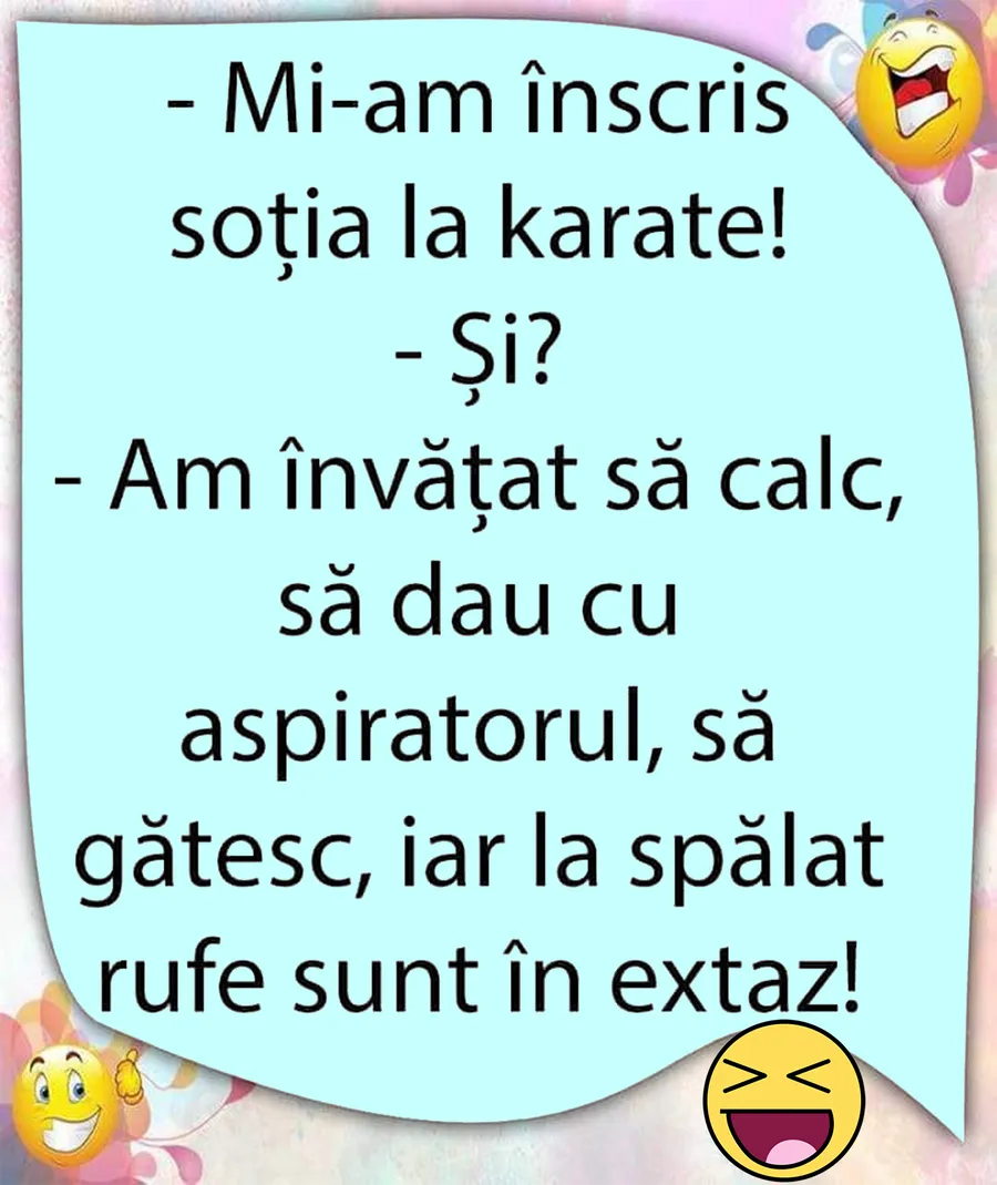 Dragi cititori, CANCAN.RO vrea să vă aducă zâmbetul pe buze în această zi, așa că vă pune la dispoziție un banc amuzant. Dialogul hilar dintre doi bărbați, după ce unul dintre ei și-a trimis soția la cursuri de karate. Vei râde cu lacrimi!