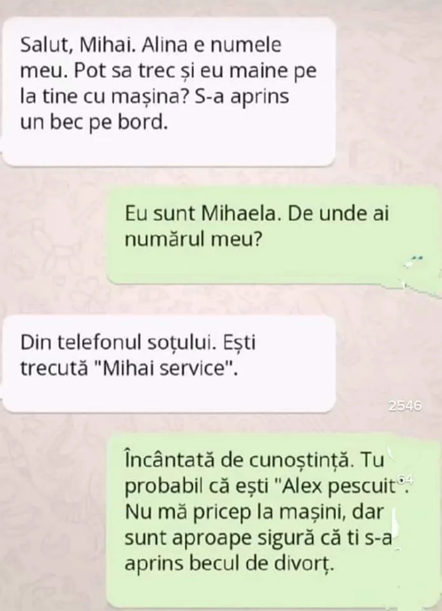 -Din telefonul soțului. Ești trecută ”Mihai service”.