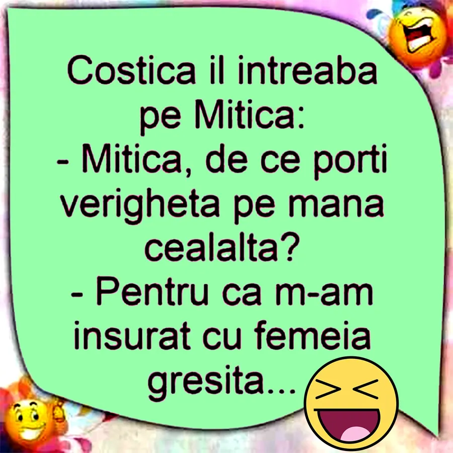 Dragi cititori, CANCAN.RO vă prezintă un banc de nota 10, menit să vă aducă zâmbetul pe buze. Costică observă că Mitică poartă verigheta pe mâna dreaptă și este curios să afle motivul. Răspunsul lui va stârni, cu siguranță, hohote de râs. Spor la citit!
