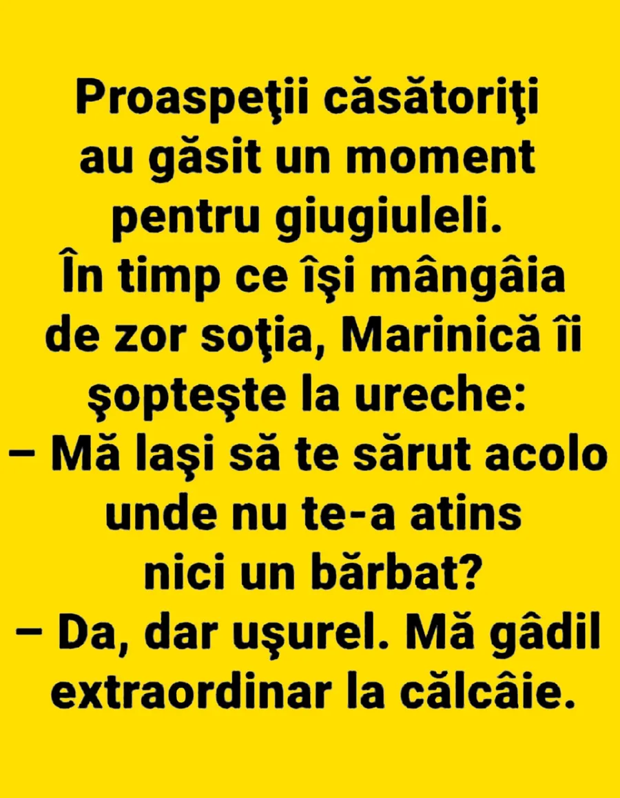 Dragi cititori, CANCAN.RO vrea să vă aducă zâmbetul pe buze în această dimineață, așa că vă pune la dispoziție un banc amuzant. Conversația hilară dintre doi tineri, abia căsătoriți. Ce propunere siropoasă i-a făcut bărbatul soției lui? Vei râde cu lacrimi atunci când vei citi răspunsul ei!