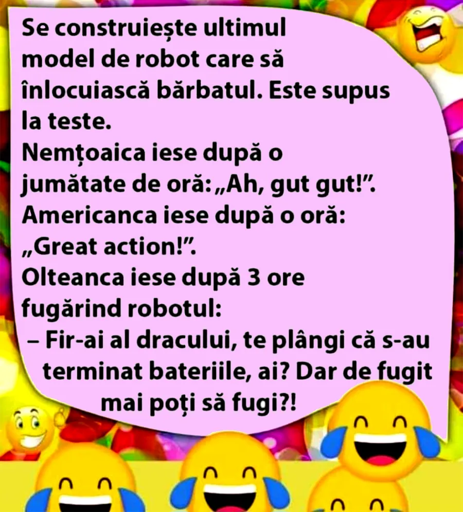 Ziua bună se cunoaște încă de dimineață, așa că trebuie începută cu zâmbetul pe buze. Iar pentru asta am pregătit un banc, care cu siguranță te va amuza copios. Protagonistele de astăzi sunt o nemțoaică, o americancă și o olteancă. Acestea testează ultimul model de robot care își propune să înlocuiască bărbatul. Deznodământul este hilar.