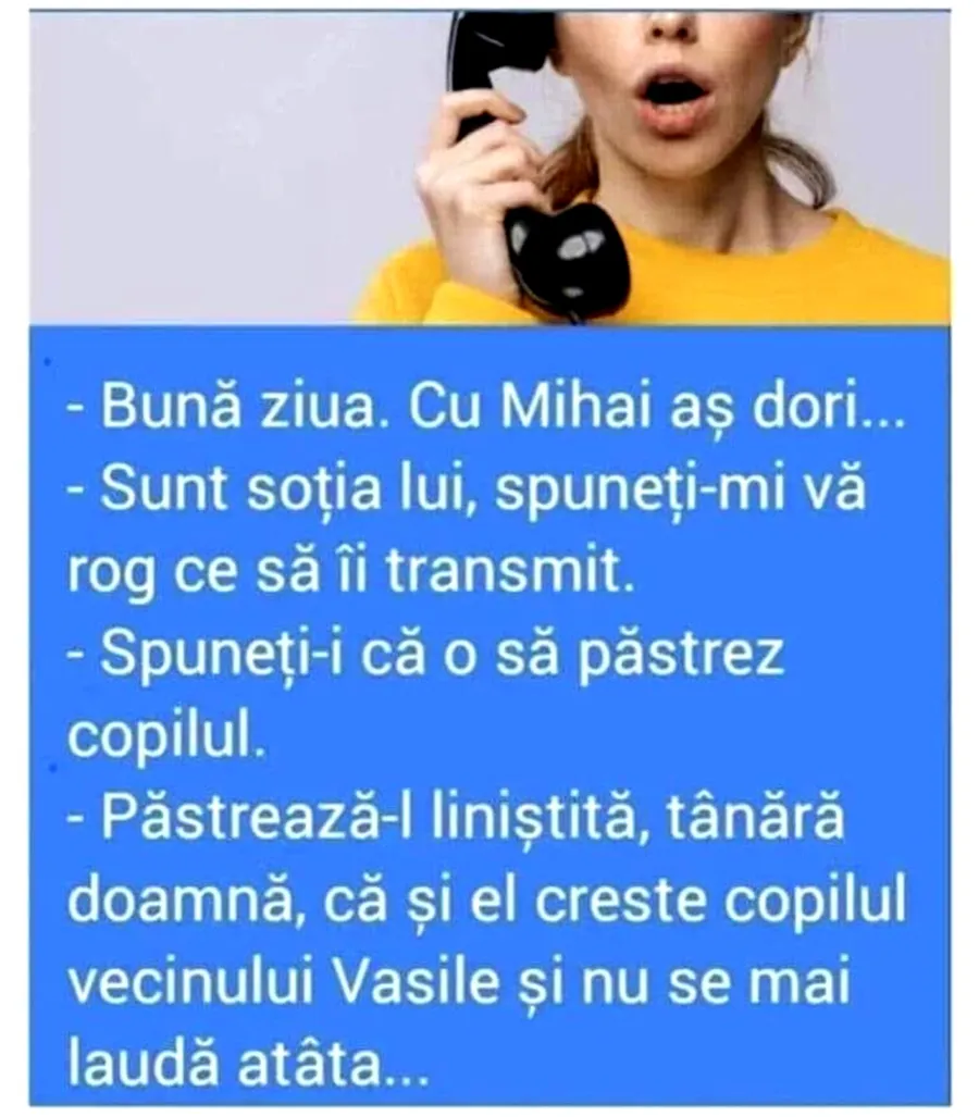 Este zi de weekend, de relaxare, așa că este momentul și pentru o porție copioasă de râs. Iar pentru asta am pregătit un banc care cu siguranță îți va aduce zâmbetul pe buze. Protagonista de astăzi este o soție, care vorbește cu amanta partenerului său. Deznodământul este hilar.