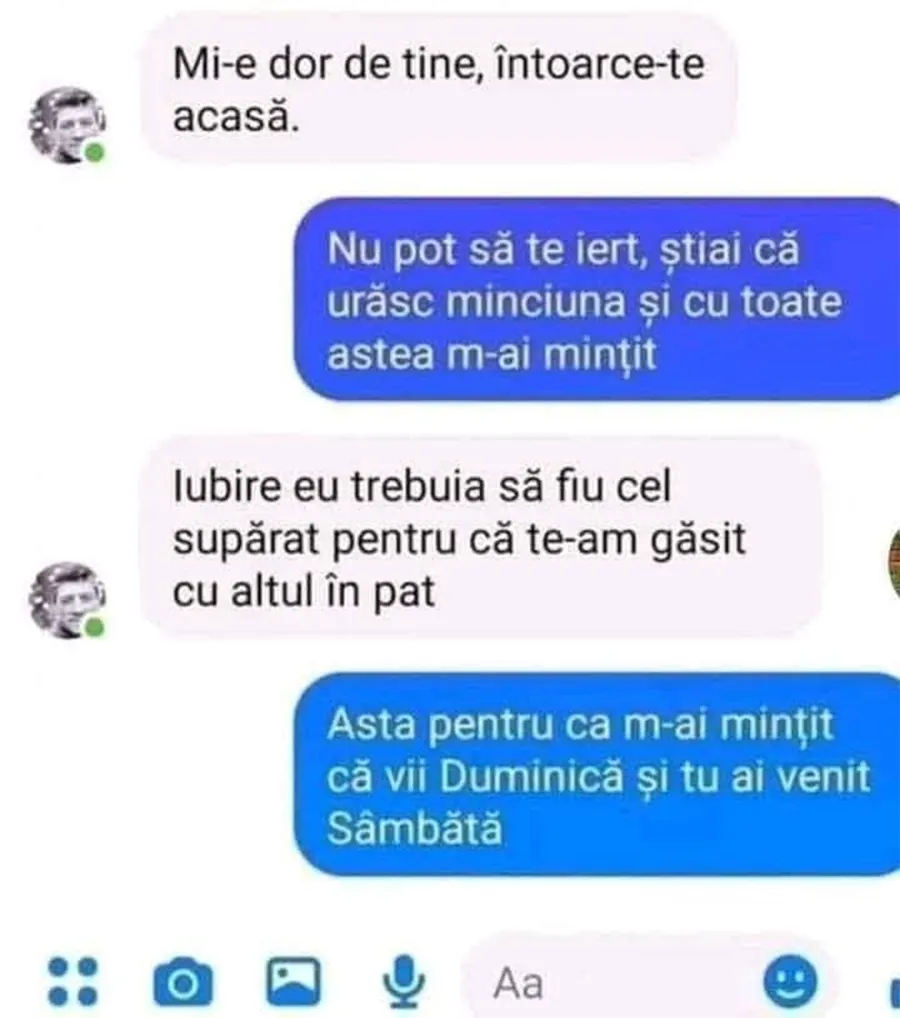 – Asta pentru că m-ai mințit că vii duminică și tu ai venit sâmbătă!