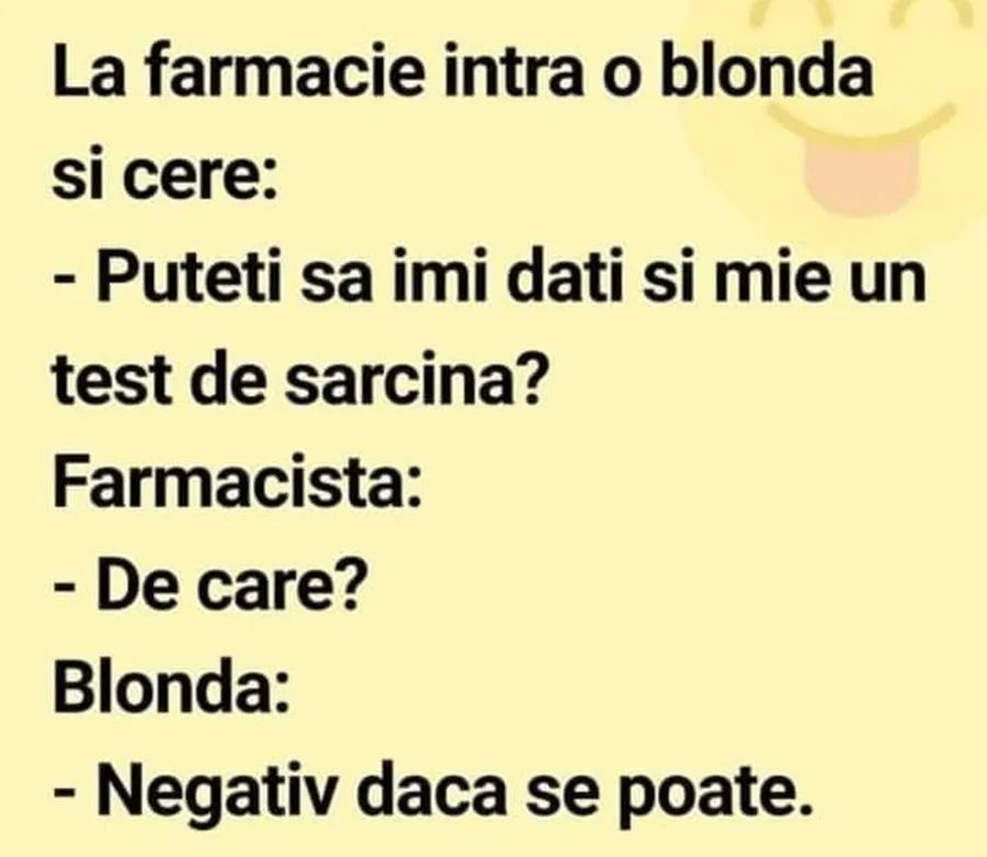 Nu trebuie să treacă nicio zi fără o porție copioasă de râs, tocmai de aceea am pregătit un banc care, cu siguranță, te va amuza copios. Protagonista de astăzi este o blondă care merge la farmacie pentru a cumpăra un test de sarcină. Deznodământul este hilar.