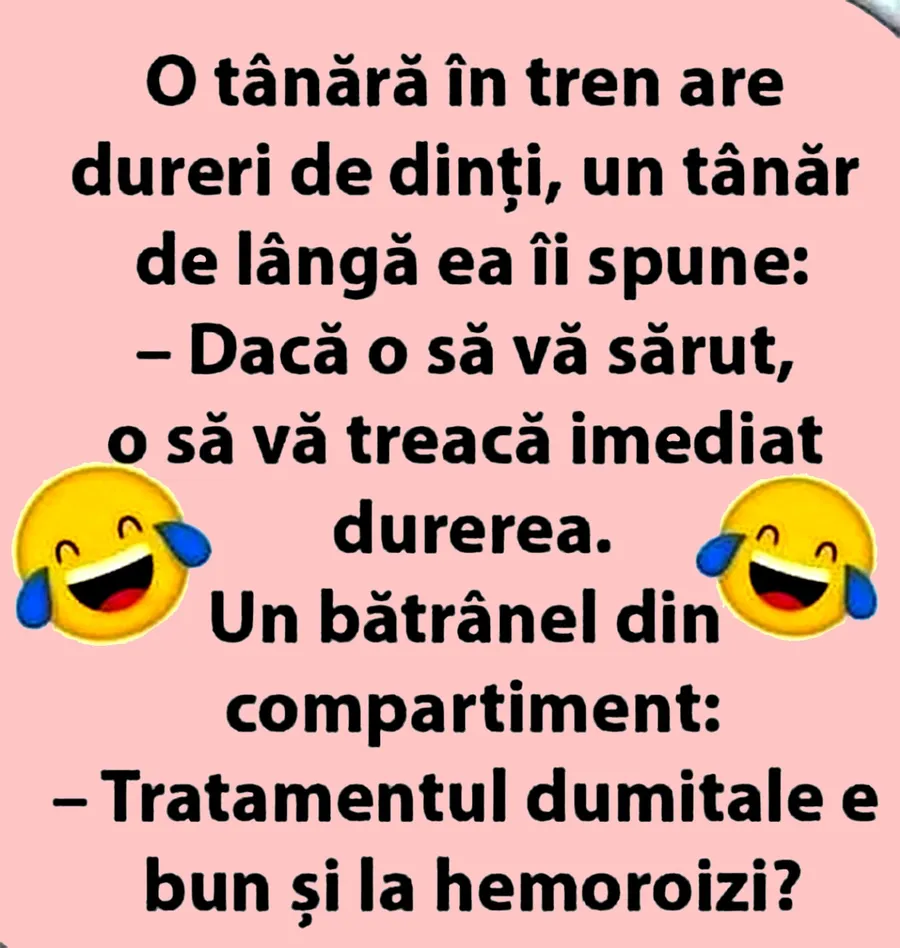 Este zi de weekend, de relaxare și distracție, iar startul îl dăm cu un banc bun, care cu siguranță o să îți aducă zâmbetul pe buze. Protagoniștii de astăzi se află într-un tren, iar totul pornește de la o tânără care are dureri de dinți. Deznodământul este hilar.