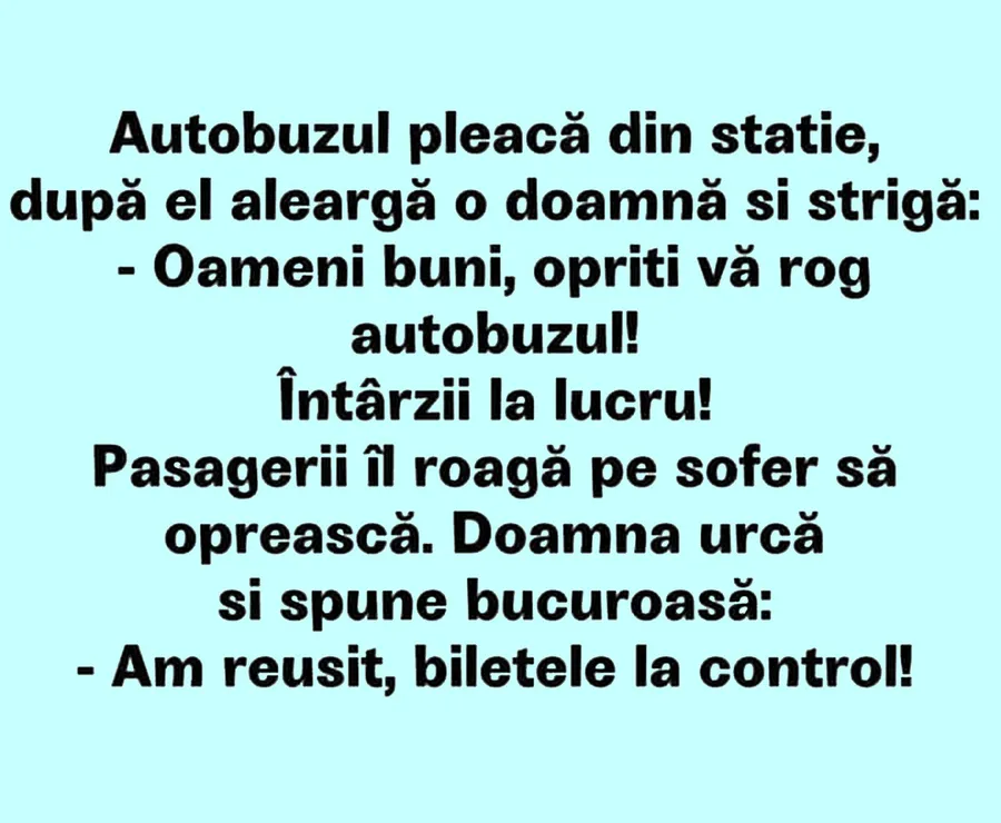 Dragi cititori, CANCAN.RO vrea să vă aducă zâmbetul pe buze, așa că v-a pregătit un banc amuzant. O femeie aleargă după autobuz și strigă la șofer să oprească vehiculul, să urce și ea pentru că întârzie la muncă. Pasagerii îi transmit conducătorului auto, el oprește mașina, iar ceea ce urmează te va face să râzi cu lacrimi!