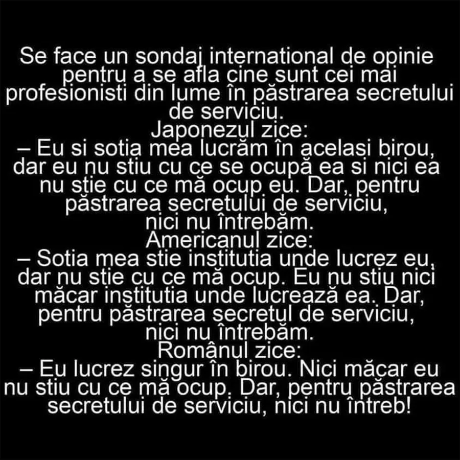– Eu și soția mea lucrăm în același birou, dar eu nu știu cu ce se ocupă ea și nici ea nu știe cu ce mă ocup eu. Dar, pentru păstrarea secretului de serviciu, nici nu întrebăm.