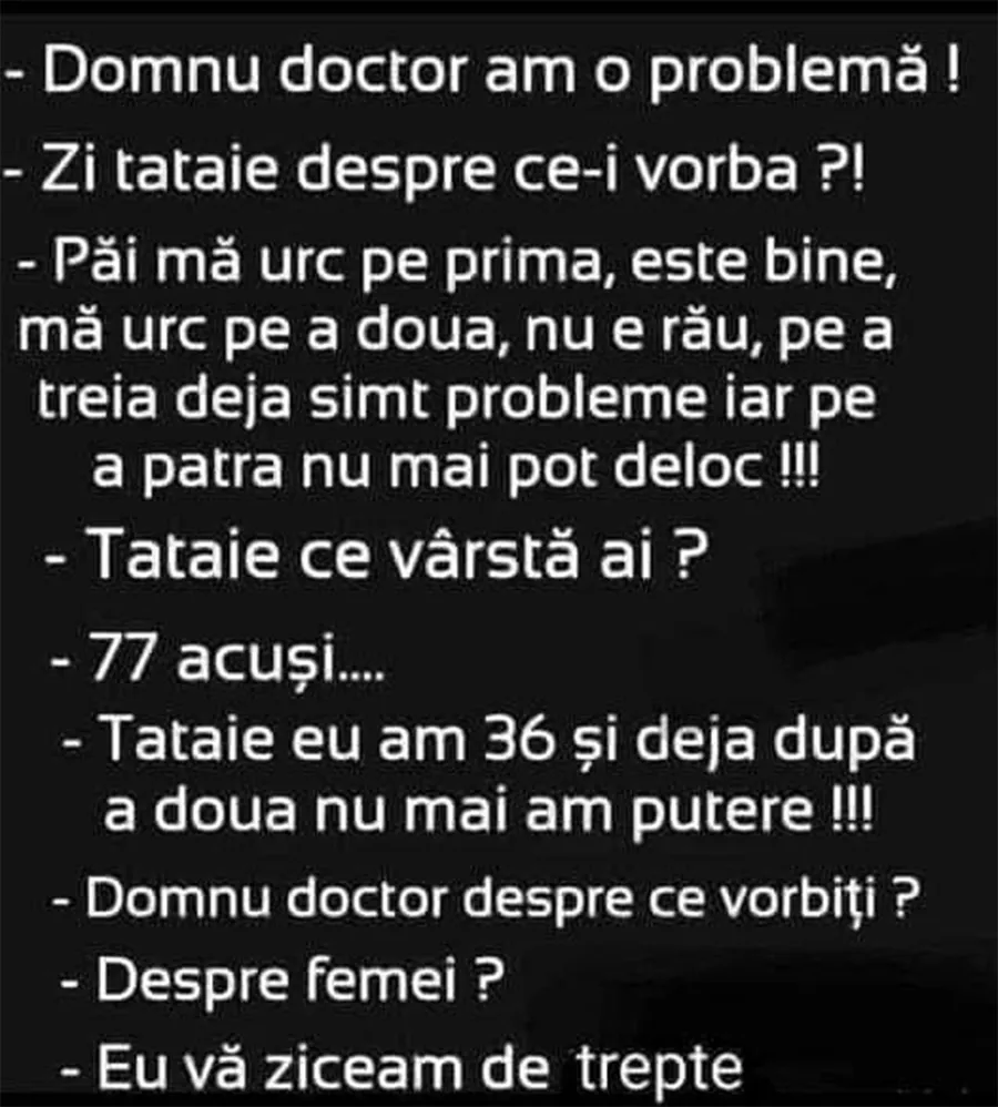 – Păi mă urc pe prima, este bine, mă urc pe a doua, nu e rău, pe a treia deja simt probleme, iar pe a patra nu mai simt deloc!!!