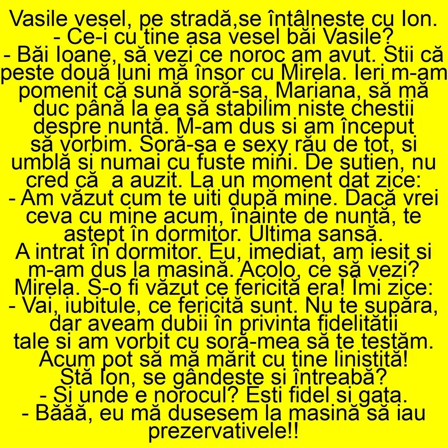 -Băi, Ioane, să vezi ce noroc am avut. Știi că peste două luni mă însor cu Mirela. Ieri, m-am pomenit că mă sună soră-sa, Mariana, să mă duc până la ea să stabilim niște chestii despre nuntă. M-am dus și am început să vorbim. Soră-sa e sexy rău de tot, și umblă numai cu fuste mini. De sutien, nu cred că a auzit. La un moment dat zice: