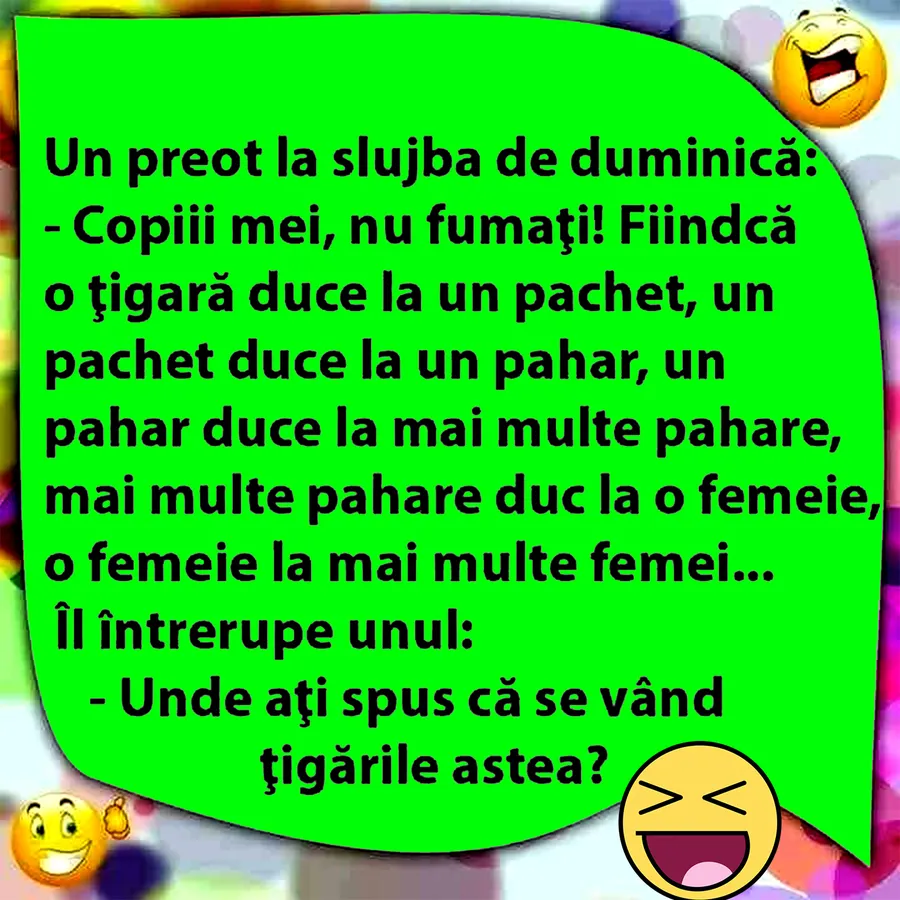Echipa CANCAN.ro vine în întâmpinarea dumneavoastră cu un nou banc amuzat, menit să vă binedispună. Azi avem o glumă amuzantă în care protagonistul este un preot care ține o predică despre fumat. Din păcate pentru el, sfatul lui către enoriași de a nu se apuca de fumat nu a fost prea bine interpretat. Vă lăsăm să vă amuzați în rândurile care urmează!