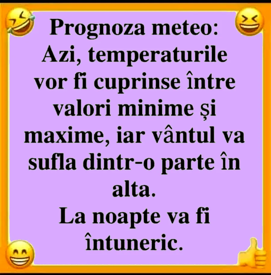 Dragă cititorule, pentru astăzi, CANCAN.RO ți-a pregătit un banc care o să-ți stârnească hohote de râs! Vezi ce „prognoză meteo” avem azi și râzi cu poftă!
