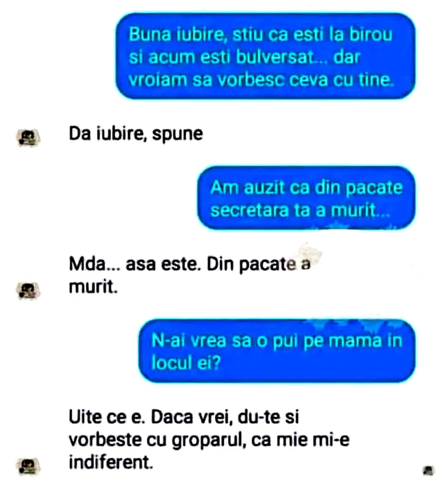 – Bună, iubire, știu că ești la birou și acum ești bulversat, dar voiam să vorbesc ceva cu tine.
