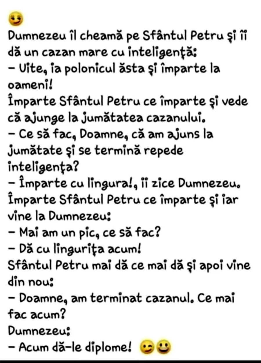 Bancul zilei. E joi, iar distracția e deja în toi. Weekendul se apropie cu pași repezi, iar redacția CANCAN.ro v-a pregătit un banc savuros, care va stârni amuzamentul! Protagonistul de azi este Sfântul Petru, care dezvăluie secretul cazanului cu inteligență. Spor la distracție și la voie bună!