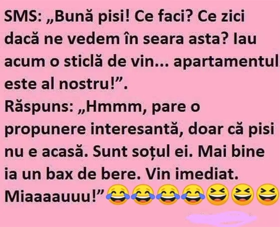 Răspuns: Hmm, pare o propunere interesantă, doar că pisi nu e acasă. Sunt soțul ei. Mai bine ia un bax de bere. Vin imediat. Miaaau”.