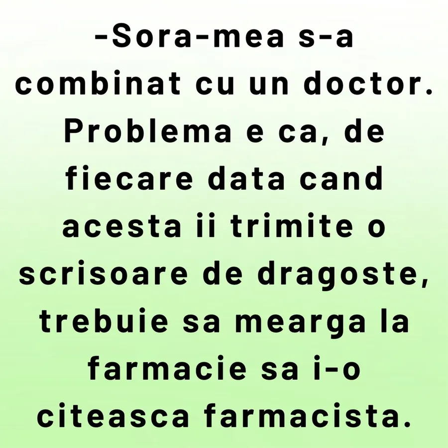 – Sora-mea s-a combinat cu un doctor. Problema e că, de fiecare dată când acesta îi trimite o scrisoare de dragoste, trebuie să meargă la farmacie să i-o citească farmacista.